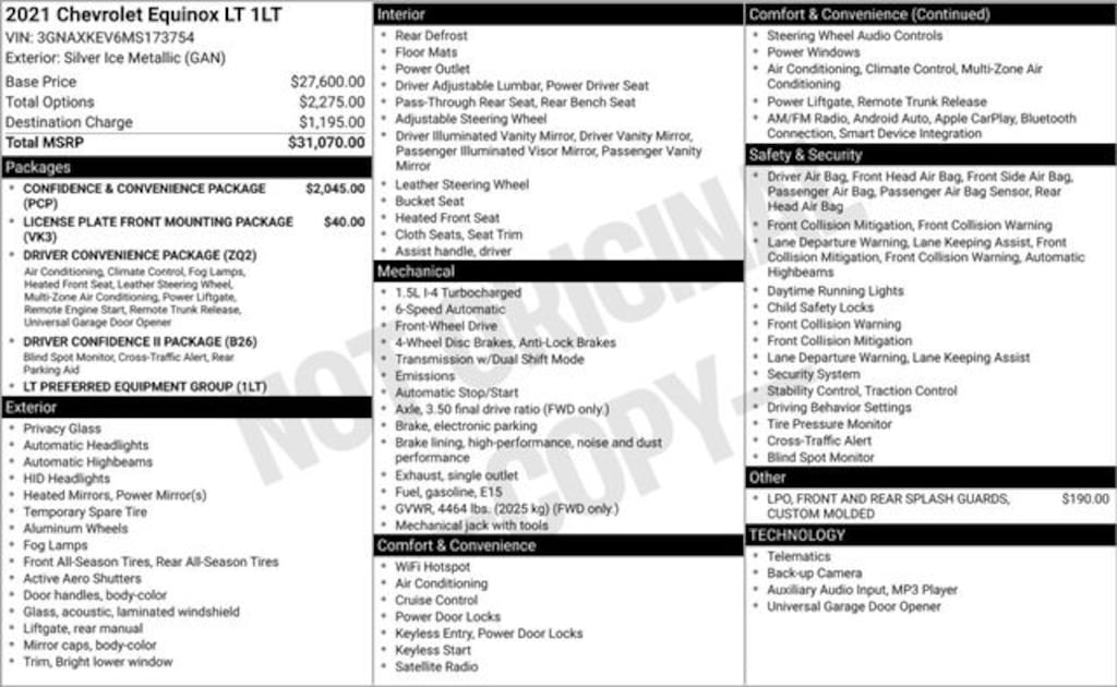 Silver Ice Metallic 2021 Chevrolet Equinox LT FWD 6-Speed Automatic Electronic with Overdrive 1.5L DOHC **CLEAN VEHICLE HISTORY REPORT**, **LOCAL TRADE IN**, 3-Spoke Leather-Wrapped Steering Wheel, Confidence & Convenience Package, Driver Confidence II Package, Driver Convenience Package, Dual Zone Automatic Climate Control, Front Fog Lamps, Heated Driver & Front Passenger Seats, Lane Change Alert w/Side Blind Zone Alert, Preferred Equipment Group 1LT, Rear Cross Traffic Alert, Rear Park Assist w/Audible Warning, Rear Power Liftgate, Remote Start, Universal Home Remote.