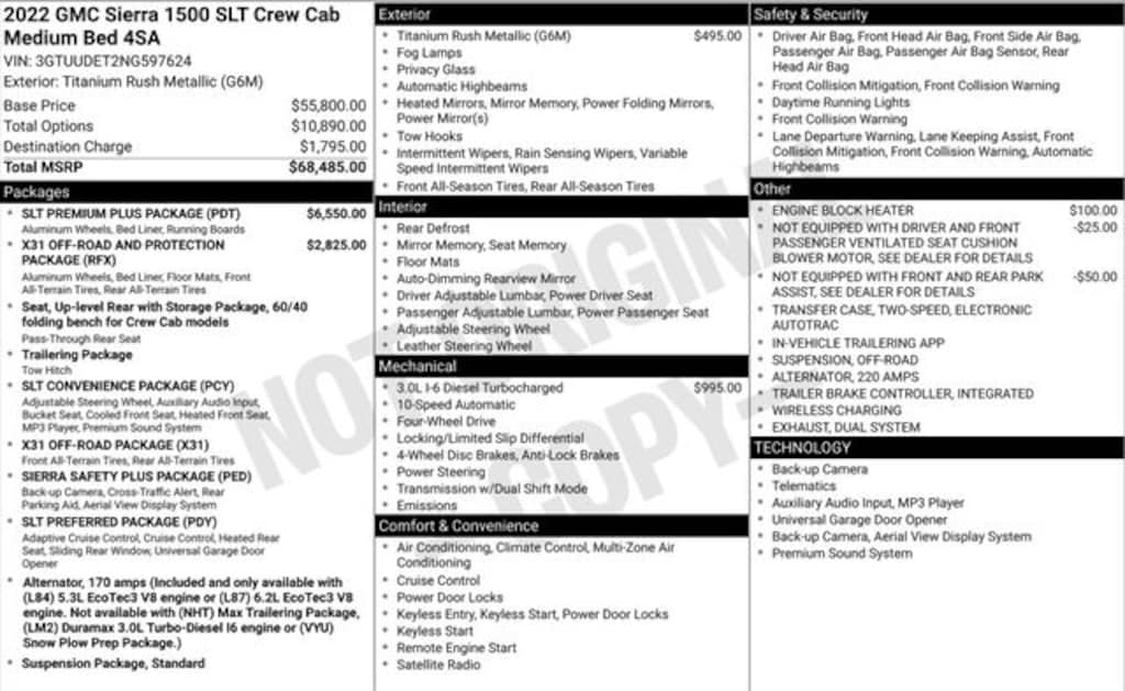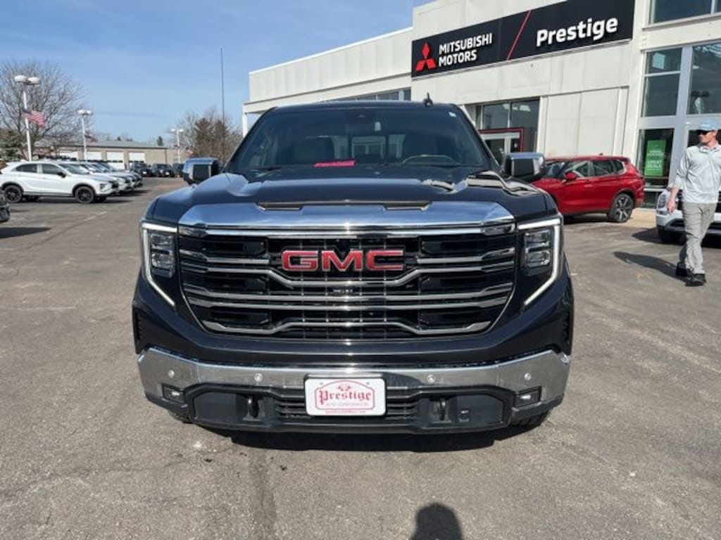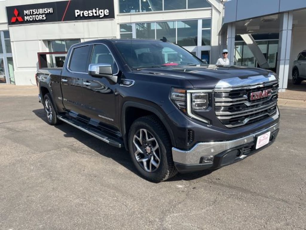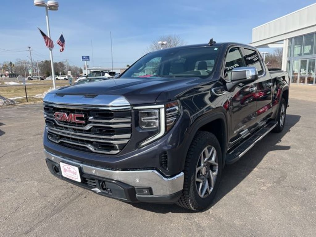 Titanium Rush Metallic 2022 GMC Sierra 1500 SLT 4WD 10-Speed Automatic 3.0L I6 **CLEAN VEHICLE HISTORY REPORT**, **LOCAL TRADE IN**, 10-Way Power Driver Seat Adjuster w/Lumbar, 10-Way Power Passenger Seat Adjuster w/Lumbar, 170 Amp Alternator, 20" Polished Aluminum Wheels, 3.23 Rear Axle Ratio, 6 Speakers, 6-Speaker Audio System Feature, Adaptive Cruise Control, All-Weather Floor Liner (LPO), Alloy wheels, AM/FM radio: SiriusXM with 360L, Apple CarPlay/Android Auto, Auto-Locking Rear Differential, Automatic Emergency Braking, Brake assist, Buckle to Drive, Bumpers: chrome, Chrome Wheel To Wheel Assist Steps, Delay-off headlights, Driver door bin, Driver Memory, Driver vanity mirror, Dual Exhaust System, Electric Rear-Window Defogger, Electronic Stability Control, Emergency communication system: OnStar and GMC Connected Services capable, Following Distance Indicator, Front 40/20/40 Split-Bench Seat, Front anti-roll bar, Front Center Armrest w/Storage, Front dual zone A/C, Front License Plate Kit, Front Pedestrian Braking, Front reading lights, Front wheel independent suspension, Fully automatic headlights, HD Rear Vision Camera, Heated Steering Wheel, Heated steering wheel, Heavy-Duty Air Filter, High Capacity Suspension Package, Hill Descent Control, Illuminated entry, In-Vehicle Trailering App, Integrated Trailer Brake Controller, Low tire pressure warning, Not Equipped w/Steering Column Lock, Occupant sensing airbag, Off-Road Suspension, Outside temperature display, Overhead airbag, Overhead console, Panic alarm, Passenger door bin, Power Door Locks, Preferred Equipment Group 4SA, Premium audio system: GMC Infotainment System, ProGrade Trailering System, Push Button Start, Radio data system, Radio: Premium GMC Infotainment Audio System, Rear reading lights, Rear step bumper, Rear window defroster, Security system, Sierra Safety Plus Package, SLT Convenience Package, SLT Preferred Package, SLT Premium Package, SLT Premium Plus Package, Speed-sensing steering, Split folding rear seat, Spray-On Pickup Bed Liner w/GMC Logo, Standard Suspension Package, Steering wheel mounted audio controls, Tachometer, Telescoping steering wheel, Tilt steering wheel, Trailering Package, Trip computer, Universal Home Remote, Variably intermittent wipers, Voltmeter, Wheels: 18" x 8.5" 6-Spoke Machined Aluminum, Wireless Charging, X31 Hard Badge, X31 Off-Road & Protection Package, X31 Off-Road Package.