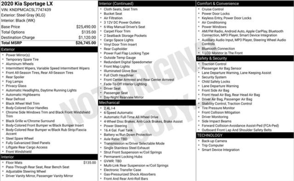 Steel Gray 2020 Kia Sportage LX AWD 6-Speed Automatic Electronic with Overdrive 2.4L I4 DGI DOHC 16V **CLEAN VEHICLE HISTORY REPORT**, **LOCAL TRADE IN**, 6 Speakers, Bumpers: body-color, Overhead console, Rear window wiper, Speed-sensing steering.